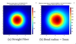 In FTTH, optical fibers are frequently bent at the corners of the walls causing the propagating light in the fiber to radiate away which results in transmission losses and limits reach of the fiber network. A large number of studies have been reported in the literature to compute bend-induced losses in fibers. However, most studies assume simple refractive index profiles such as step-index profile and include the effects of stress due to bending of fiber in an ad hoc manner by modifying the bend radius R to effective bend radius Reff = (1+δ)R, where δ is a number in the range {0.28, 0.31}. For simulations with arbitrary refractive index profiles, which are encountered commonly in practice, the refractive index of the bent fiber is modified into refractive index of an equivalent straight fiber using simple conformal mapping techniques.