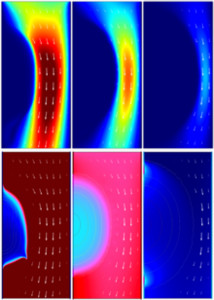In a soil pore, water flows through the biofilm, where the density of the latter was assumed to represent a flow resistance. This mechanism was implemented as a local change of fluid viscosity proportional to local biofilm density. It was assumed that diffusive substrate transport is possible through the biofilm region such that the biofilm was able to degrade the substance. Maximum flow velocities decreased while biofilm was spreading.