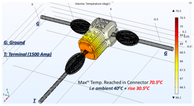 In modern days one of the biggest challenges is to have a special connector for very high current power supply which shouldn’t exceed the rating temperature of 90°C at full load. This main challenge it to design special connectors of aluminum (Al). In this study, a new approach is defined to design a unique connector made of Al which will not exceed the rating temperature and dissipate the heat very fast due to its well-organized fins and shape. The thermal analysis via COMSOL Multiphysics® gave a clear picture that the fins ratio for both the side should be maintained in a specific ration which gives the maximum heat dissipation power and the practical experiments showed that there are no large potential difference drop when the connectors are attached with any HTLS conductor.
